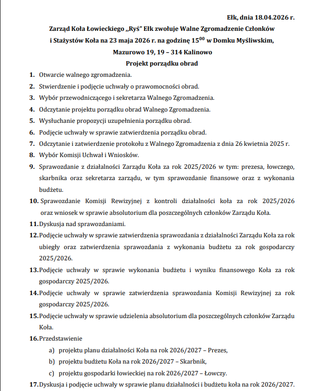 Walna Zgromadzenie Członków i Stażystów KŁ „Ryś” w Ełku – 2026